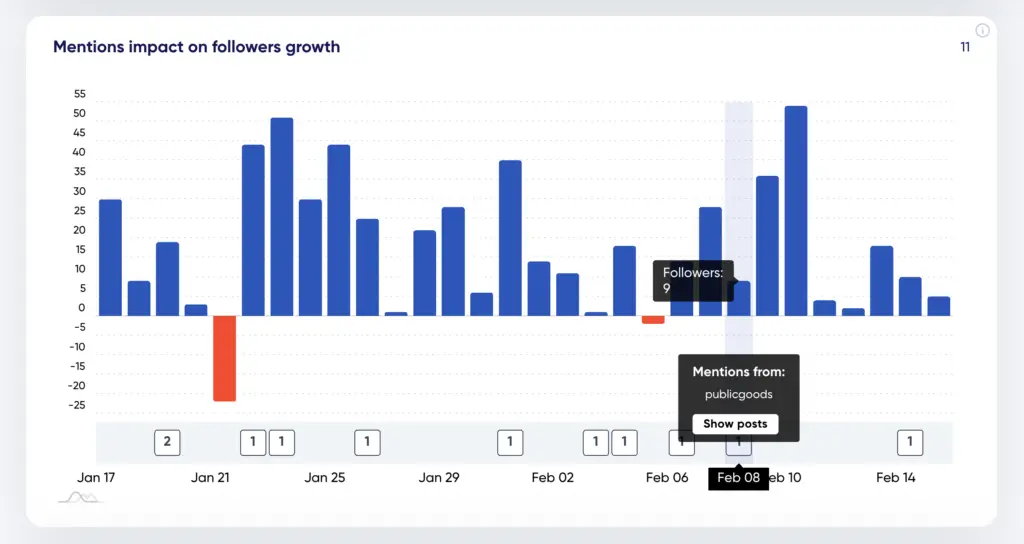 Moving on to the Tracking module, you can keep track of a number of influencers or brand accounts via social listening. Here you’ll find a number of insights that are common—follower growth, ideal posting times, and top hashtags to name a few—but then there also insights that are unique to trendHERO. One notable one is the graph showing follower growth in the wake of a mention. A general rule of thumb is to look with suspicion at sudden bursts in audience count, because that looks like the influencer bought a bunch of followers to inflate their numbers (and their asking price). While this is a good assumption, it’s not always true: sometimes someone gets mentioned and another popular account, driving audiences over to follow. trendHERO gives a much clearer picture of growth spurts in this way.