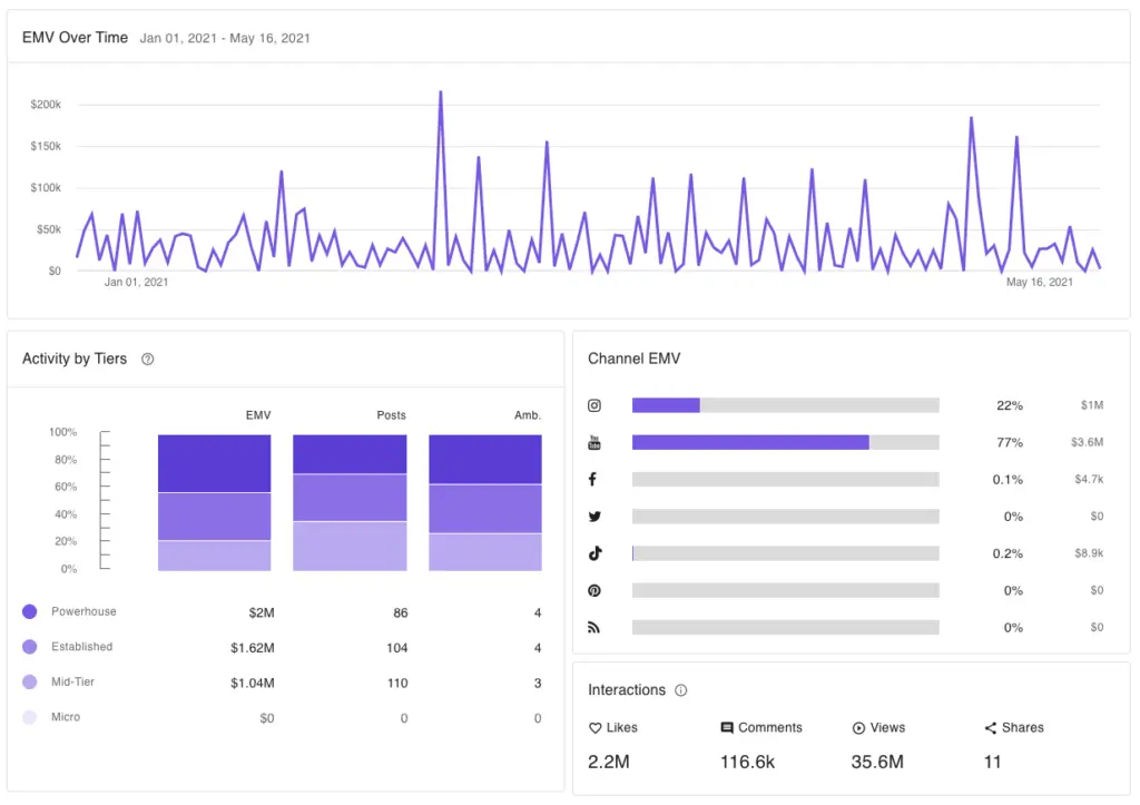 What they mean by this is that Tribe Dynamics aims to take a holistic approach to analyzing and measuring the influence landscape. Note that I said “influence landscape” and not “influencer marketing landscape.” This is because TD looks beyond just the influencers a brand may work with factoring in organic mentions by any social account. They were the first to use the metric of Earned Media Value for social media—they claim to have created it in 2014, in fact. Earned media itself was not a new marketing concept, but Tribe Dynamics’ EMV algorithm was. To measure and calculate the value of earned media is to understand the impact of social posts. As you no doubt know, EMV is pretty much the standard metric for understanding the return on ad spend. This shows a keen understanding of the industry they chose to play in, and a further look into the software itself bears this conclusion out.