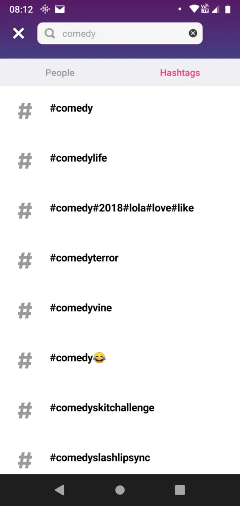 You can enter any term you’d like in the search bar to find related hashtags. Here’s an example search for “comedy:”