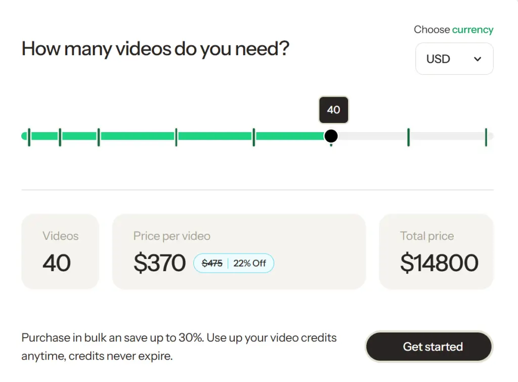 On the brand side, Twirl operates on a transparent, pay-per-video model. Brands buy video “credits” in bulk, with each credit covering a fully produced UGC asset: usage rights, professional editing, clean and final cuts, 2 aspect ratios of choice, and up to two rounds of revisions. The more credits they buy, the lower the per-video cost.