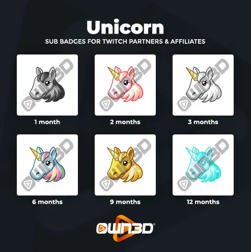 Unicorns may not be real but they're still a fan favourite. These six unicorns are ideal for affiliates and partners who stream fantasy games. What makes the unicorn badge particularly attractive is the transition subscribers make. In the first month, they receive what appears to be a horse badge. By month two, what once looked like a horse transforms into a unicorn.