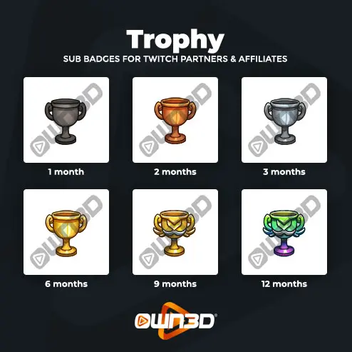 Like medals and insignia, trophies are some of the more obvious badges to offer your subscribers. And that's absolutely okay. Trophies are powerful symbols of success through adversity. While watching your stream may not equate to pain and suffering, being rewarded with a trophy for sticking it out as a subscriber is still well worth it.