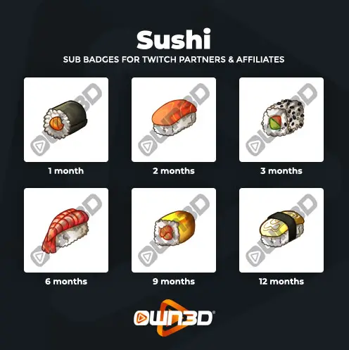There's something special about sushi. Beyond its heritage, it holds a special place in the hearts of food lovers the world over. While you could use this set of six sushi badges on a food channel, it could also be used to identify you and your subscribers as streamers with unique taste.