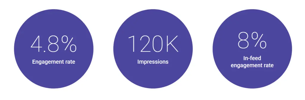 The campaign delivered record-breaking engagement, surpassing luxury category benchmarks by 139%. Overall engagement reached 4.8%, with in-feed engagement hitting 8% and impressions totaling 120,000.