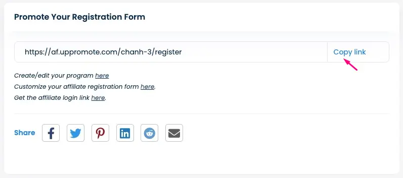 With your program set up, it’s time to find affiliates. UpPromote’s marketplace is where merchants and potential affiliates can connect: publish your program and wait for the applications to roll in. As helpful as the marketplace is, it’s likely not as reliable a place as your own website/Shopify store. For each program you create, an affiliate signup form is automatically generated, as is the link you can share to point people over to it. That link is easily added to your Shopify store, though it could be easier. It’s a little weird that Secomapp made this tool specifically for Shopify, but there’s no real integration between them for this task. If there were, you could just define from UpPromote which nav menu in Shopify will be where these links go, and it would all happen automatically. As it is, you need to copy and paste each link for each program into your Shopify admin page. That’s not difficult, but if you have many affiliate programs defined, publishing those links one at a time becomes cumbersome. Social sharing directly from UpPromote works in that same way: one link at a time to one channel at a time.