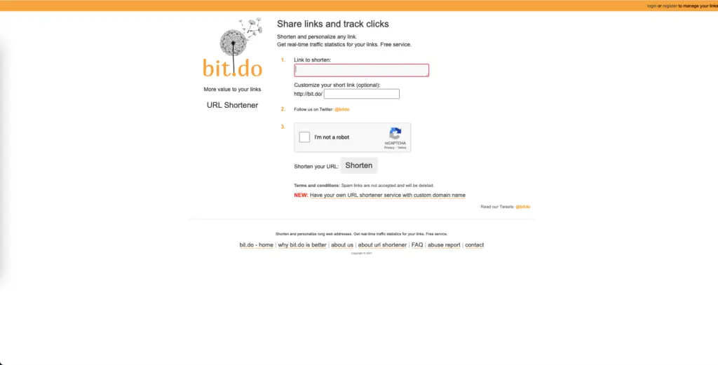 Bit.Do is a very simple URL shortener option that gives users the option to customize, view stats, and generate QR codes. If you're looking for branded domains, you'll probably want to choose another option. While Bit.Do does offer branded domains, it's a bit pricey.