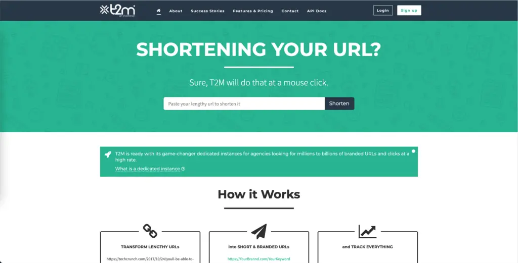T2M makes URL tracking easy through the use of two dashboards, one for location and the other for device. The platform also has a QR code generator. Since T2M has dedicated instances, the server response is dedicated to a single user, making redirection to your full URL fast. You can also use this URL shortener to create branded URLs and even, with paid plans, password-protected URLs. T2M has full-scale analytics, bulk URL creation, unlimited API, one-click domain mapping, and more.