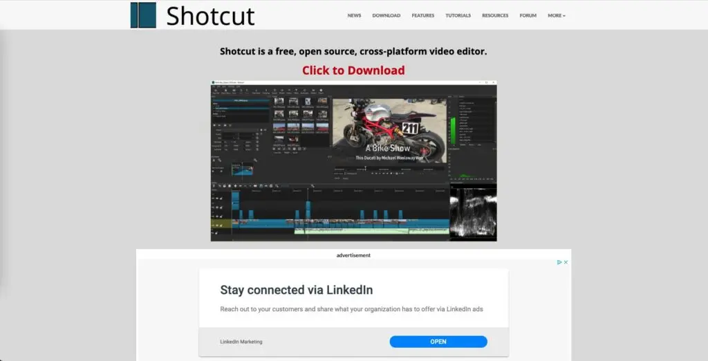 Shotcut is an open-source, free, cross-platform video editing tool with a decent number of features. Plus, you can just download and start using it. The platform supports multiple video formats and platforms. It offers 4K resolution, audio and video effects, color correction and grading, interlacing, transitions, and more.
