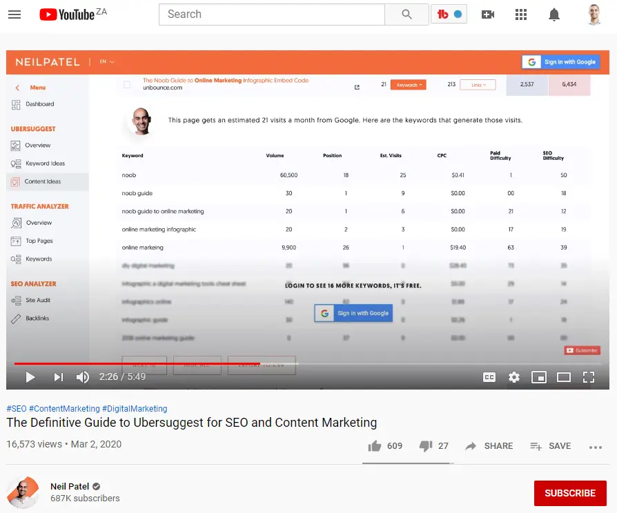 In Patel’s video, he takes the time to go deep. He covers how to use Ubersuggest and shares special features that give users insight into how competitors are ranking for search terms.