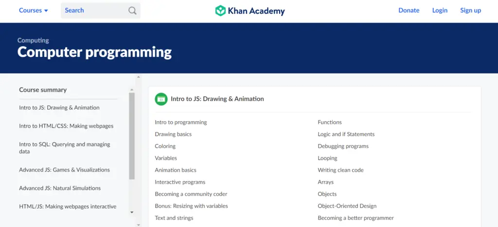 This site has a few courses on computer programming. Learn how to make interactive web pages using HTML and JavaScript. You’ll also find basic courses on drawing, animation, and games.