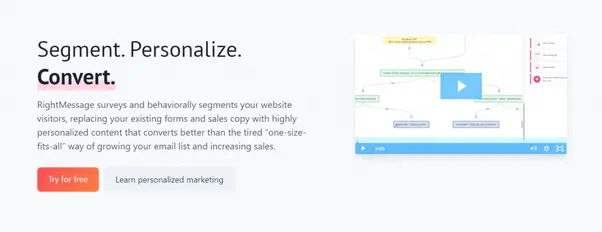 RightMessage is a segmentation tool that you can use to segment, personalize, and convert website visitors into customers. It surveys your visitors and segments them based on survey response and behavior. You can then tweak copy, forms, and other elements on your website to target visitors. The key features include:
