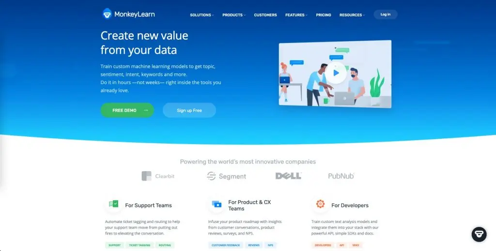 MonkeyLearn is an AI platform that lets you analyze text with machine learning to automate business workflows, saving hours of manual data processing. You can upload CSV or Excel files, or connect with apps via direct integrations, API, or using Zapier. MonkeyLearn accepts various forms of text data from emails, reviews, support tickets, surveys, social media, NPS feedback, and more. Then, you use text analysis models to automatically tag your text. There are pre-built models available or your can build your own. From there, you can connect with visualization tools like Looker, Google Data Studio, and Tableau to gain insights into your business.