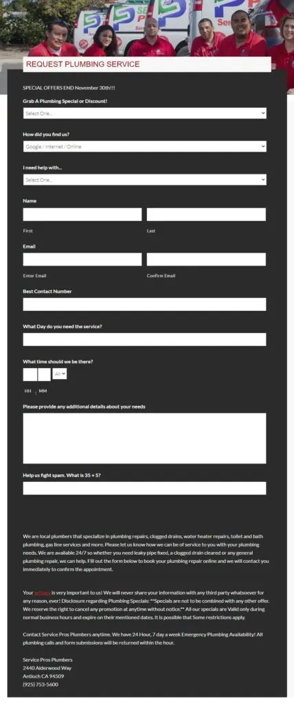 This landing page has entirely too many form fields. We would recommend breaking down this form into a multi-step form and including a progress bar so users know how much more time they're going to be spending filling it out. According to research by Venture Harbour, multi-step forms can lead to 300% more conversions. Wherever possible, limit your form fields to no more than five or break your form into a multi-step form.