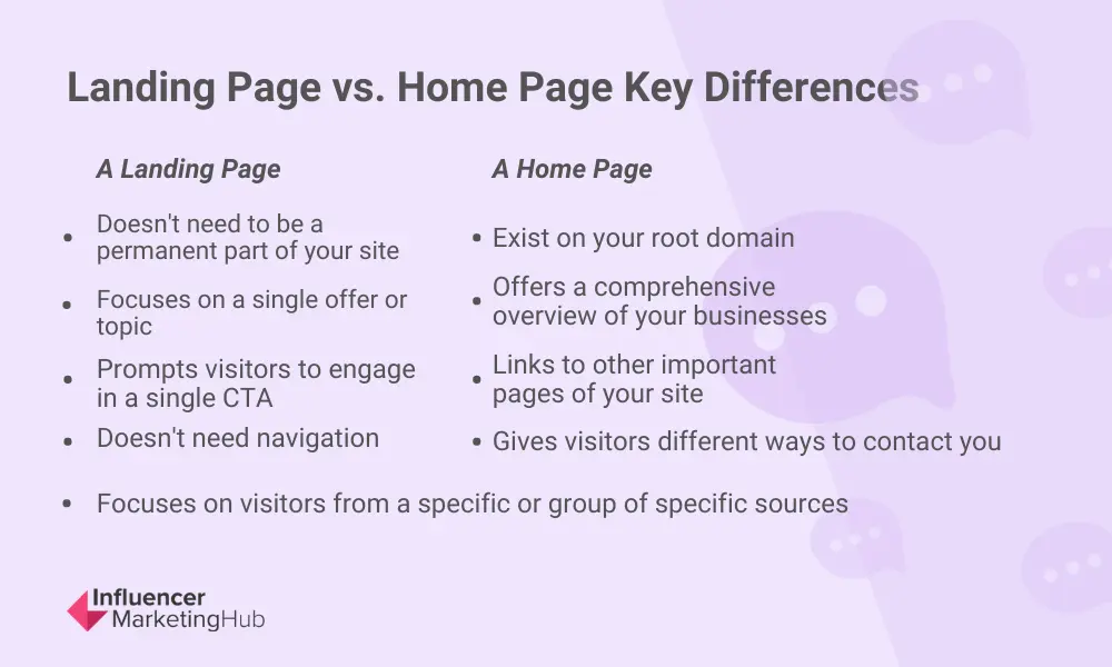 The main difference between a landing page and a homepage is purpose. Homepages are designed to tell visitors more about your brand and business. While you can optimize a homepage for conversions, landing pages are built for conversions. A homepage encourages visitors to click around, read something, maybe take a look at your About page. A landing page is geared towards a specific campaign with a specific goal—and no distractions.