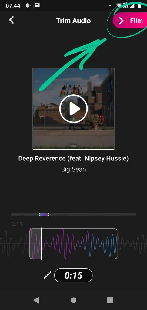 Now that you’ve chosen your audio clip, tap Film in the upper right corner of the screen to record different video takes or upload a video from your device: