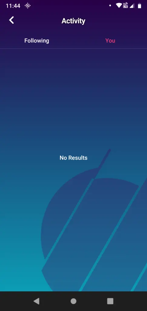On the navigation bar, you’ll also see a bell symbol. This is the Activity screen that includes two sections: You and Following. The You section shows reactions to your videos and comments. To see activity from the people you follow, you’ll check the Following section. When you first join Triller, your Activity screen will be just as empty as the one above.