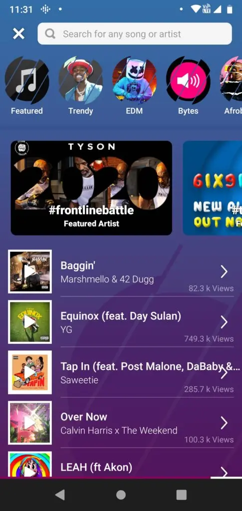 On the navigation bar, there’s a music note symbol that will take you to the Discover page. Here, you can find and search for music. Once you’ve found a song you like, you can play it, use it in your own Triller video, or check out other top videos that feature the song. Triller has licensing partnerships with Sony Music Entertainment, Universal Music Group, and Warner Music Group, so chances are you’ll find whatever popular song you’re looking for.