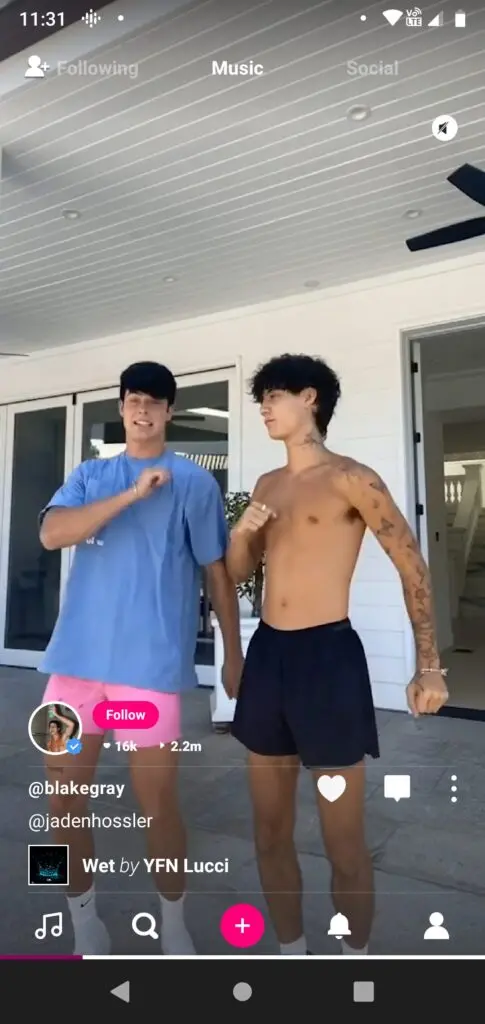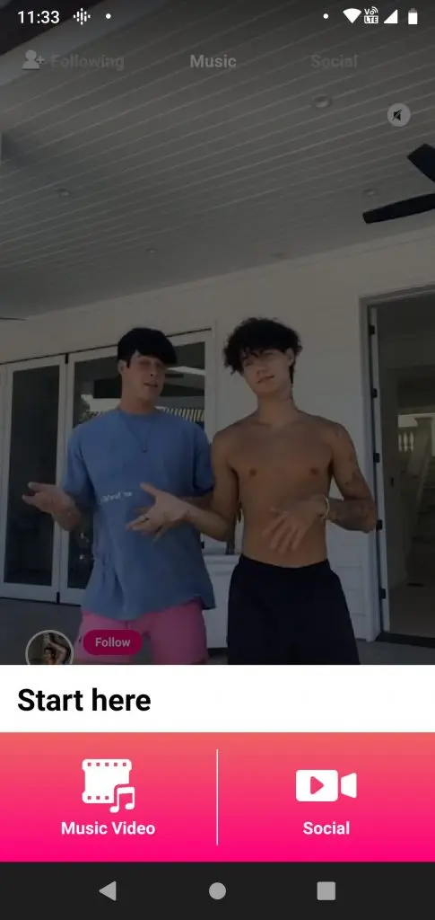 Open Triller and you’re greeted by the Triller Home page. This is the video feed and it’s broken down into three tabs: Following, Music, and Social. The Music and Social tabs are similar to TikTok’s For You page. You can use them to find trending videos from other users. All videos on Triller display vertically and in full screen. To move through the videos, just swipe up or down.