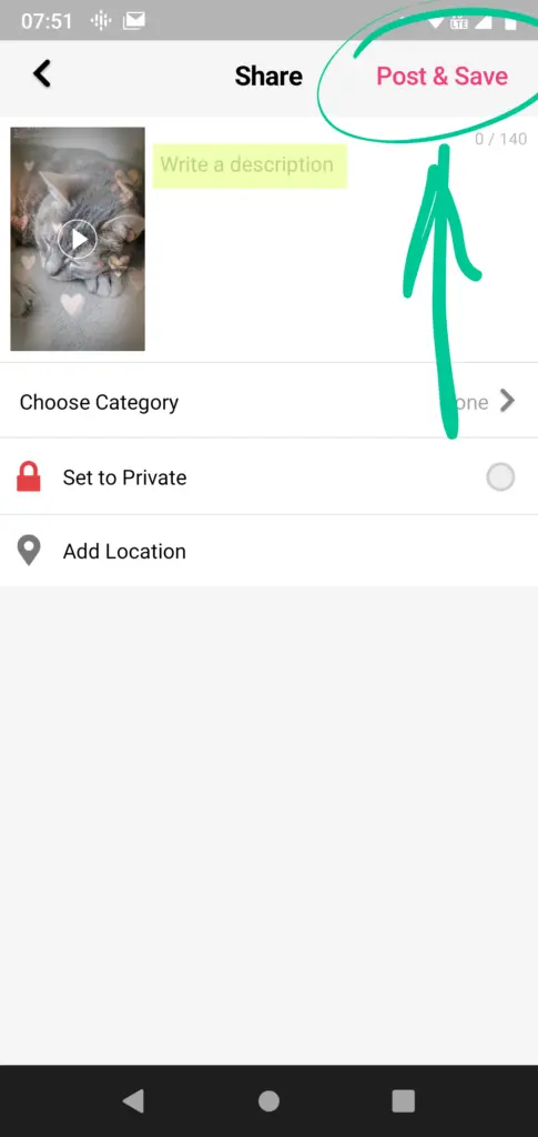 Next, add your video description, choose the category you want, add a location, or set your video to private. Then, tap Post & Save: