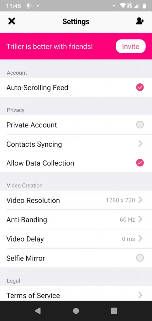 To access your Triller settings, go to Profile from the navigation bar, and tap the Settings icon in the top corner of the Profile page. Here, you can change your account settings, privacy settings, and set video preferences like resolution and more.