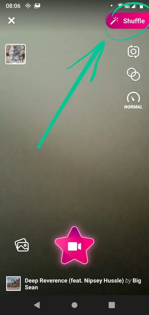 After you’ve recorded all the takes you want and are ready to post, tap Shuffle in the top right corner of your screen: