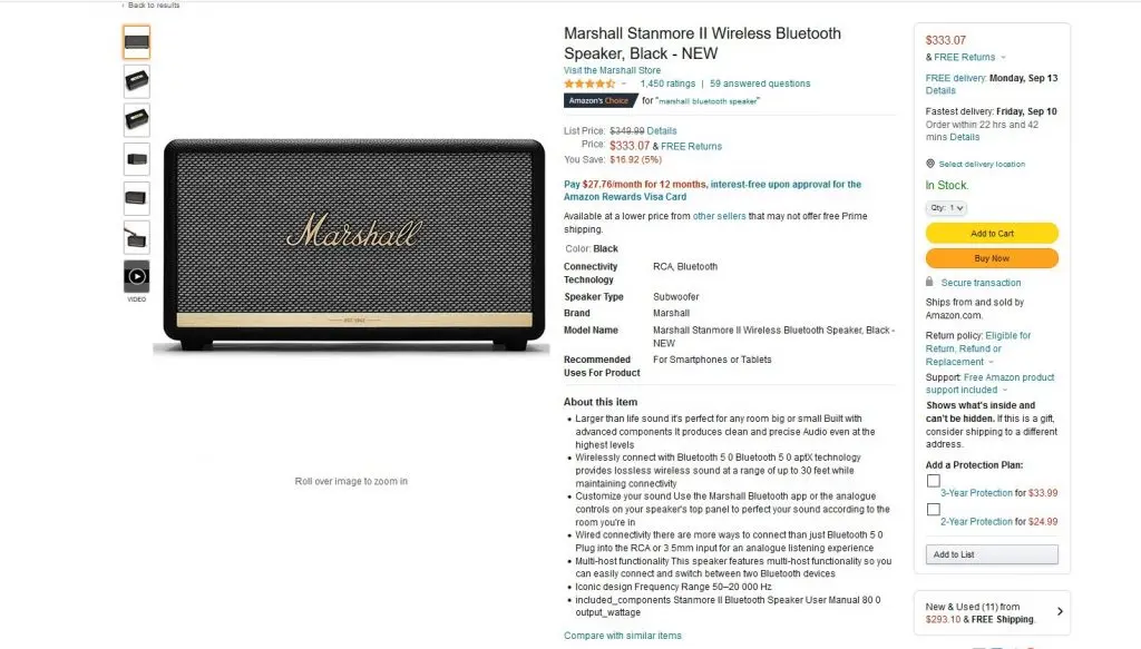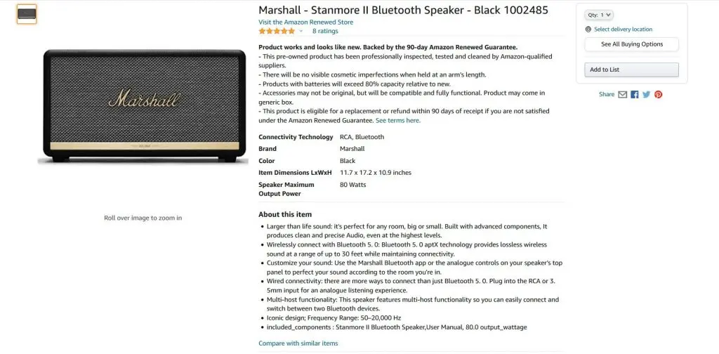 For example, several sellers list Marshall Bluetooth speakers on Amazon. These sellers can have the same general product details listed, such as the name and the model number. However, where they differ is in their listing information. Certain details, such as product condition, price, and shipping options, may differ. Take a look at the examples below. Notice that while they feature the same product, one is new while the other is pre-owned.