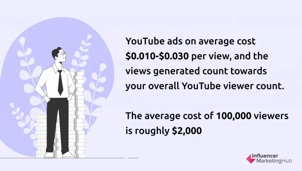 • YouTube ads on average cost $0.010-$0.030 per view, and the views generated count towards your overall YouTube viewer count.