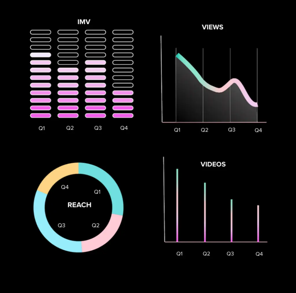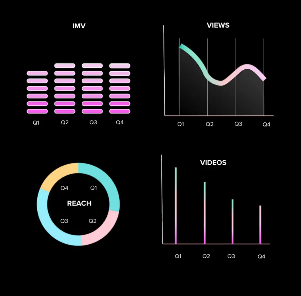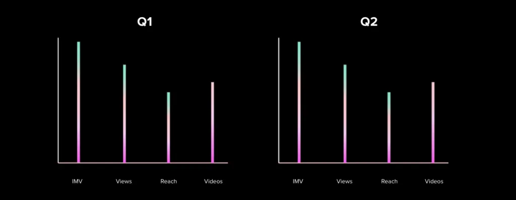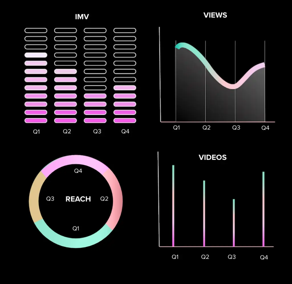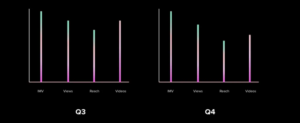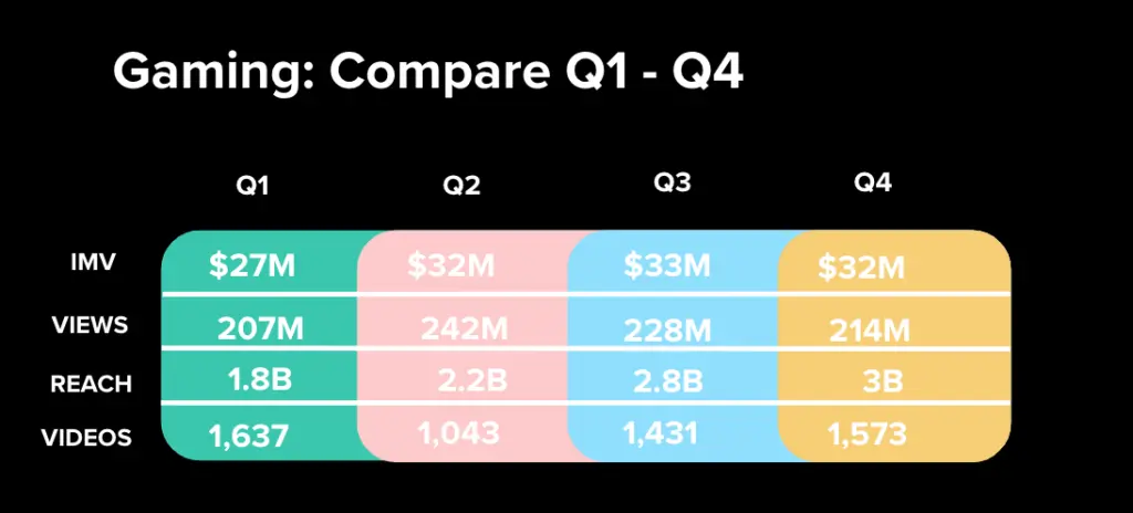 By analyzing the Gaming Industry’s metrics from Q1-Q4, we can see that there was an overall increase in IMV, views, and reach throughout the quarters. The amount of videos in Q4 were slightly lower than that of Q1, but that is the only overall decrease. In Q4 of 2021, the IMV had increased from Q1 by $5M and the reach by more than 1 billion.