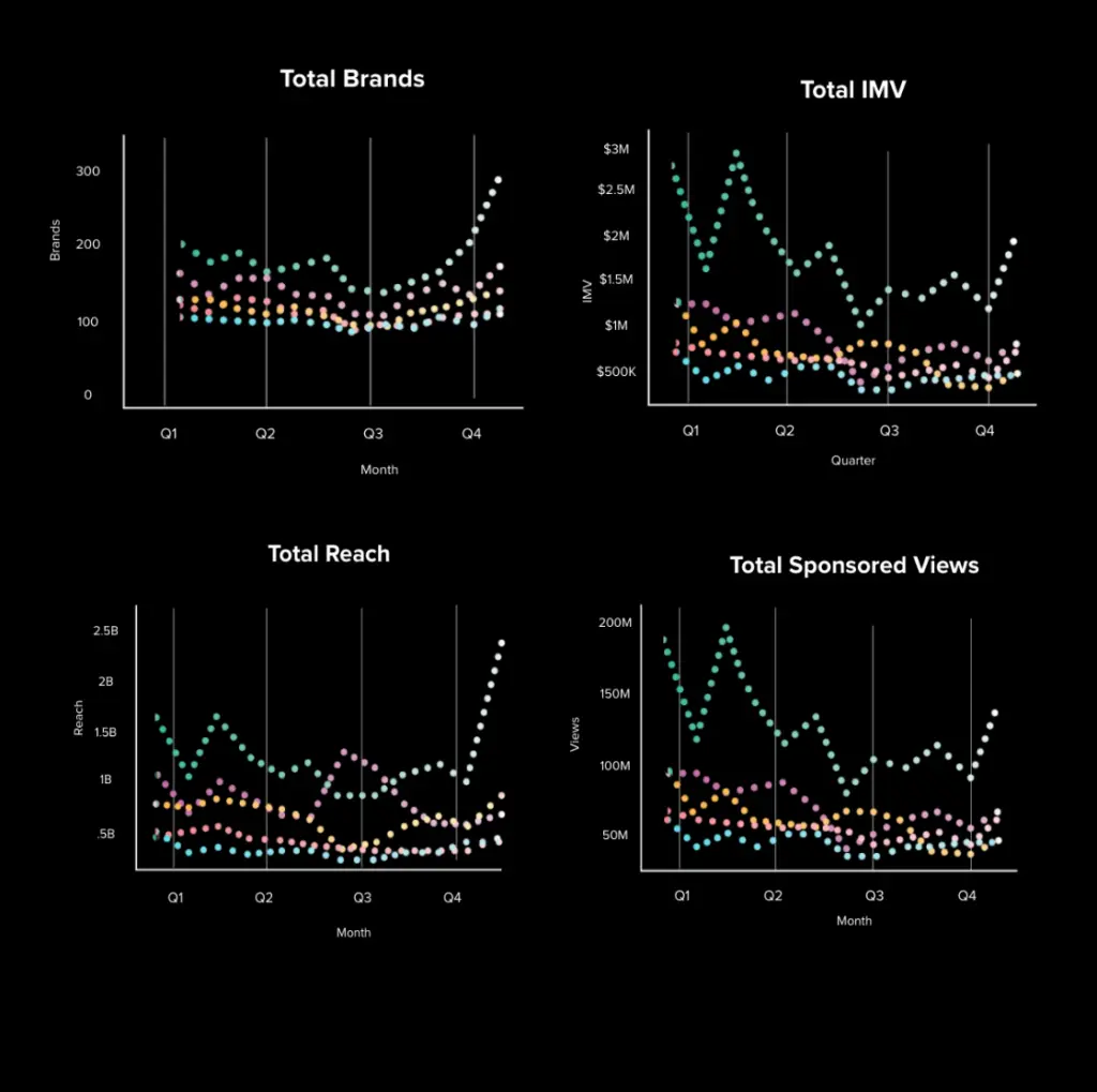 In our analysis, we identified the top 4 brands that experienced a significantly high growth in IMV and views over 2021: (1) Meta PC, (2) Invisalign, (3) Genshin Impact, and (4) SimpliSafe. These are the fastest-growing brands breaking into the influencer marketing space as part of their social media marketing strategy. Meta PC had the greatest jump in IMV from Q1 to Q4 2021 with a 9393% increase in spend and 11665% growth in views on sponsored content. Each of these brands increased from an IMV of under $100K to one reaching nearly $1M or even higher.