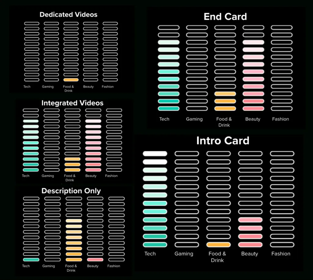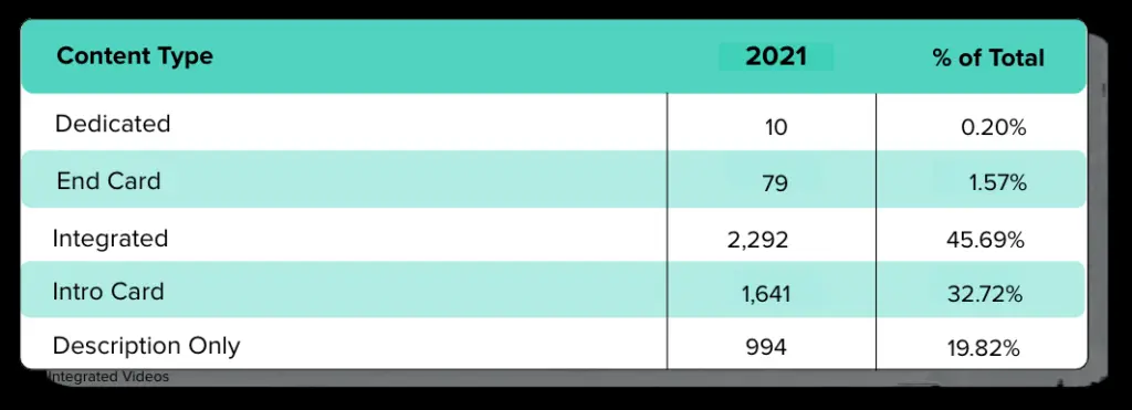 Out of the qualifying videos, integrated content continues its winning streak as the dominant content type, appearing in 45% of videos from the top 10 brands in 2021. Intro cards, which were once less than half as popular as integrated content, now represent over 32% of the total. Similarly, the description only content time has also grown to almost 20% in 2021.