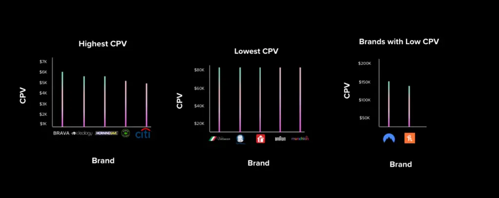 Competing for the top campaign of 2021 spot, we wanted to look into the calculated CPV for brands activating influencers based on our Social Intelligence API’s IMV calculation. Displayed are the top 5 and lowest 5 campaigns ranked by estimated cost per view. We then calculated the estimated CPV, cost per 1000 views. We also included a couple of recognizable brands with extremely low CPV values to compare to the industry average.