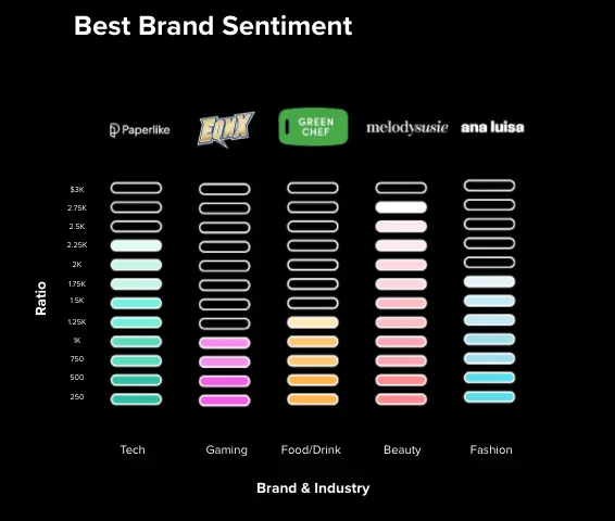 Which brands had the best response from their audiences? Brand sentiment was determined by taking the average like to dislike ratio for brands in the top 5 industries. Melody Susie was the most positively viewed sponsorship with a like to dislike ratio of almost 2900. Paperlike was close behind with a like to dislike ratio of almost 2300.