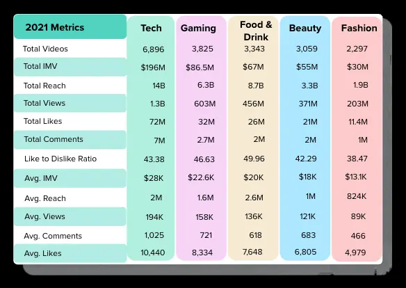 Tech was able to reach nearly 14 billion users with exactly 6,619 sponsored videos. That equates to an average reach of over 3.3M per video.