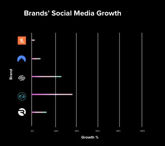 Does being a top spender correlate with a rise in followers? Taking our top 10 brands overall, we looked at their social media following growth over the 12 month period from January to December 2021 on Instagram. Skillshare experienced the biggest increase with a 58.46% growth in following. Squarespace was close behind with an increase of 36.13% over the year.
