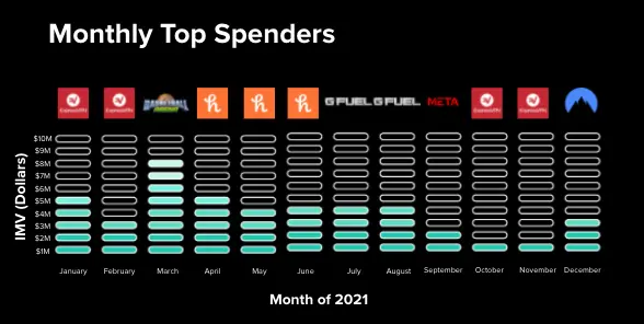 NeoReach ranks the Top Spenders on YouTube every week. We’ve taken that data for all 52 weeks of 2021 and chosen the top spender each month. Basketball Arena was the highest monthly top spender with $7.5M spent in the month of March. Following in second is Honey with an IMV of $6M in April.