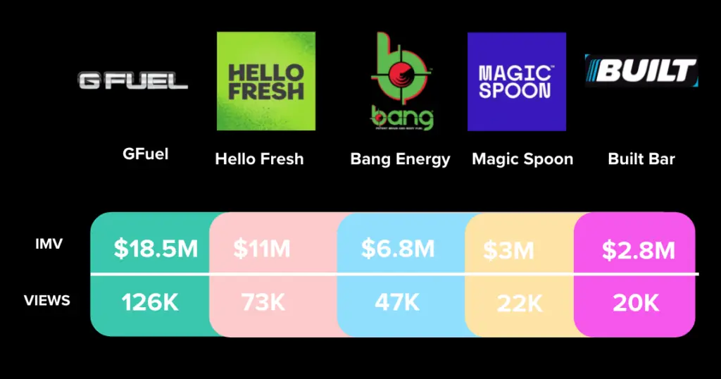Three out of the top five brand spenders in the Food & Drink industry were in the top five of the 2020 report. Magic Spoon and Built Bar have joined the list in 2021, alongside GFuel, Hello Fresh, and Bang Energy. Together, these 5 brands gathered a total of 288 million views.