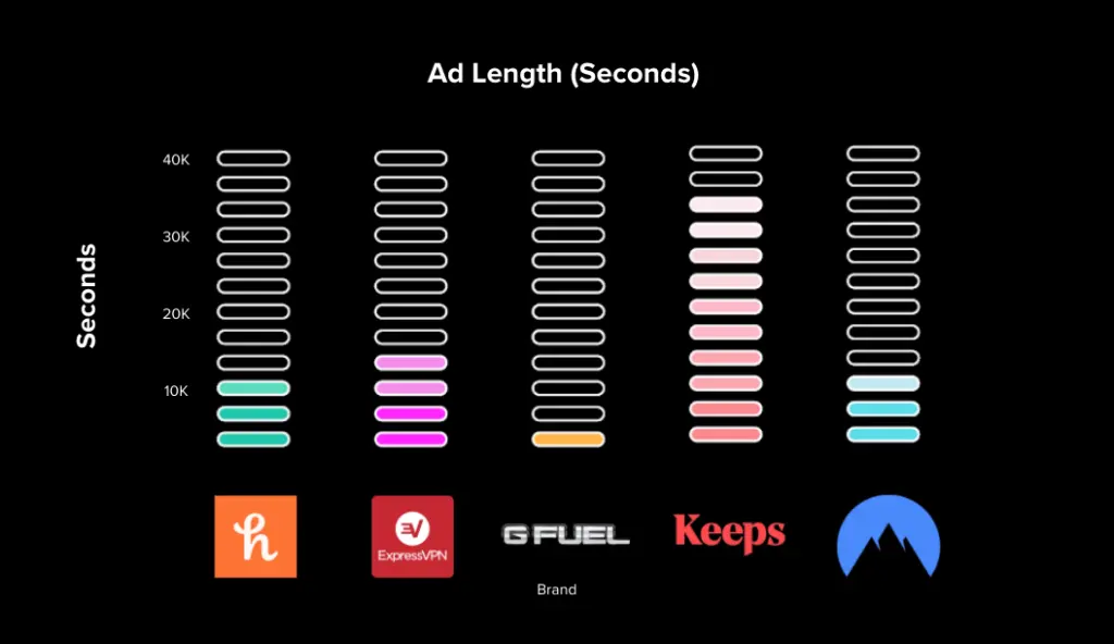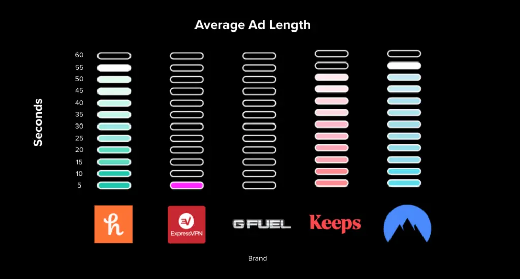 In 2021, Keeps sponsored videos with the longest ad length for a total of 38,828 seconds in sponsorship content across all of its videos. That makes up almost half of the total ad length of the top 5 spenders of 81,905 seconds. Although Keeps has the longest overall ad length, the average ad length for Honey, Nord VPN, and Keeps all ranged from around 55 to 60 seconds. Express VPN and GFuel, on the other hand, had significantly lower averages.