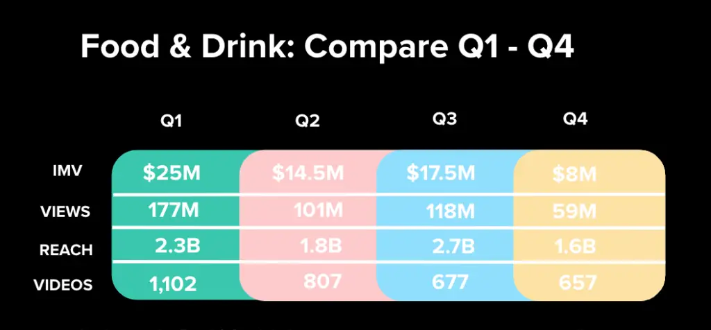 Looking at the Food & Drink Industry across quarters, we can see an overall decrease on all fronts. It is clear, with the IMV at its peak in Q1 and at its lowest in Q4, that the brands in the industry utilized influencer marketing less towards the end of 2021. With the decrease in spend, there was also a decrease in views, reach and total videos.