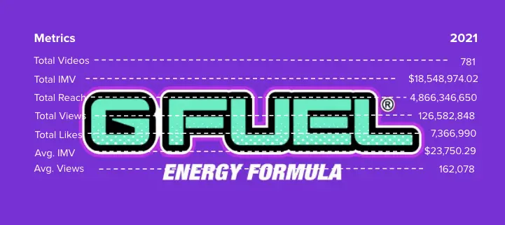 Just as it was in 2020, GFuel is the Tech Brand Spender Spotlight for 2021. The brand spent $18M on 781 videos, reaching an overall audience of 4.9B. GFuel’s IMV constitutes an impressive 27% of the total IMV for the Food & Drink Industry.