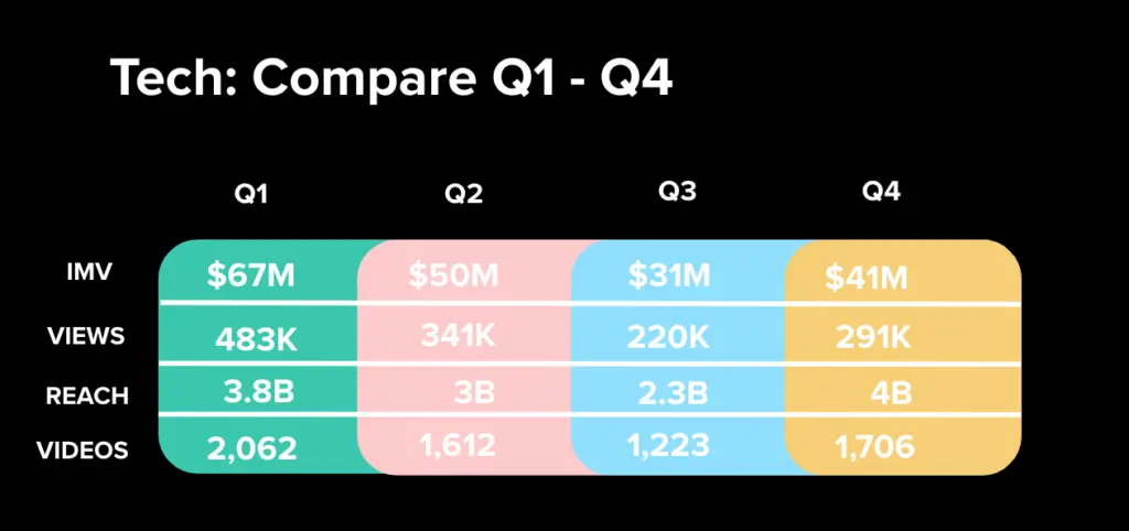 Looking at the Tech industry’s success quarter-by-quarter, we can see that the IMV, views, and number of videos created a U shape. But, one area saw a growth by the end of the year that surpassed the Q1 number. Total reach, while also forming a U shape throughout the year, ended at a peak of 4 Billion in Q4.