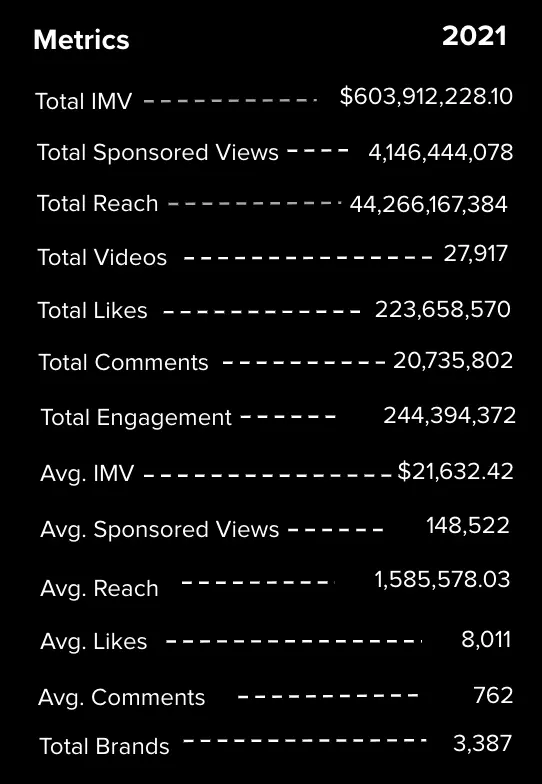The Top Sponsored Video of 2021  was a video posted by top creator, @mrbeast6000. The video had an IMV of $3.1M and a reach of 42.2M. The video was sponsored by Honey, the top spending brand of 2021.