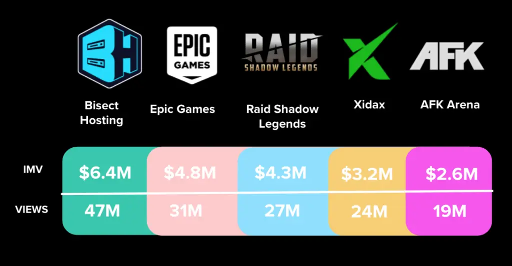 In the top spender spot, Bisect Hosting is responsible for 28% of that investment. The brand clocks in at a grand total of over 47M views and an IMV of $6.4M.