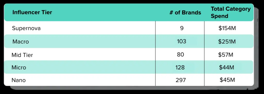 Ranking in the highest spending category, Supernova, are 16 brands who spent over $10M in influencer marketing on YouTube in 2021. 617  brands spent more than $100K over the course of the year. Each influencer tier contains brands from a variety of industries, proving that influencer marketing is a viable strategy in any economy for everyone.