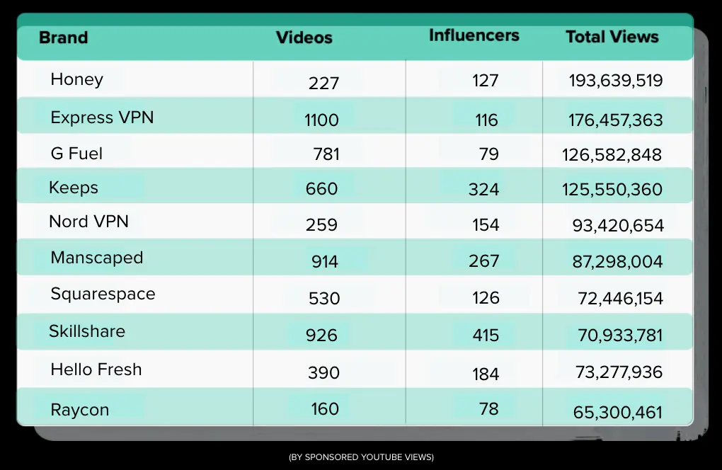 At the highest spending spot, Honey invested $29.1M in 2021 on influencer marketing on YouTube. With the top 10 brands spending over $164M, these heavy hitters only account for 27% of the total annual spend on YouTube sponsored videos.
