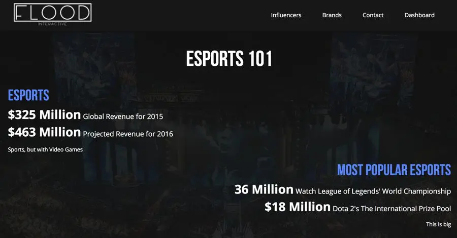 Flood Interactive与Twitch、Twitter和YouTube上的电竞网红进行合作。他们把网红与高质量的赞助商联系起来,进行协议谈判,并帮助网红设计定制化的节目来确保赞助商满意。